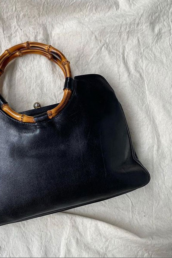 Center clasp pouch with two large pockets on either side. Has inner rings for attaching a chain.